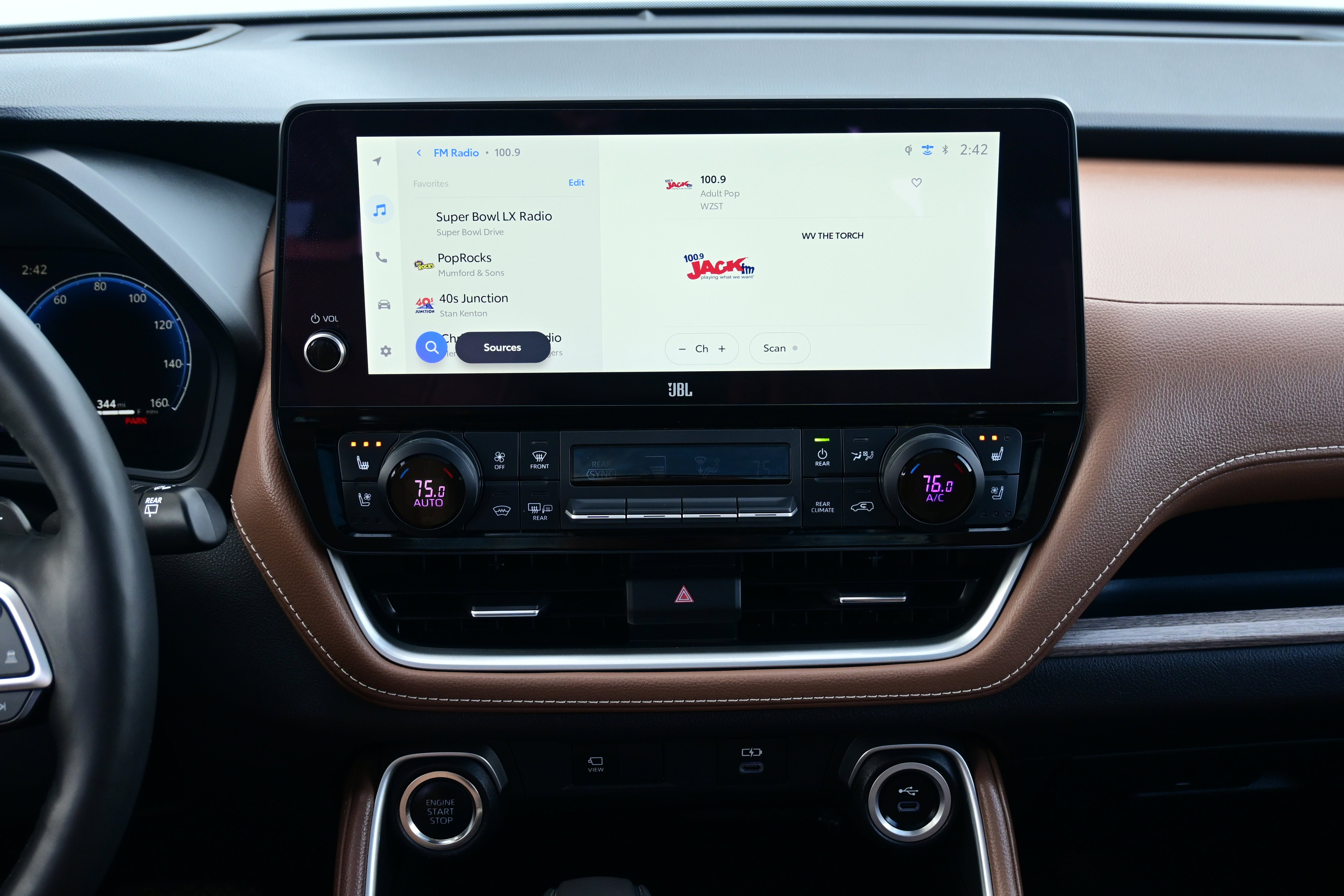 ABS brakes, Active Cruise Control, Alloy wheels, Electronic Stability Control, Front dual zone A/C, Heated door mirrors, Heated front seats, Heated rear seats, Illuminated entry, Leather Seat Trim, Low tire pressure warning, Navigation System, Power Liftgate, Power moonroof, Remote keyless entry, Traction control, 11 Speakers, 3rd row seats: split-bench, 4-Wheel Disc Brakes, Air Conditioning, AM/FM radio: SiriusXM, Apple CarPlay/Android Auto, Auto High-beam Headlights, Auto-dimming Rear-View mirror, Automatic temperature control, Brake assist, Bumpers: body-color, Delay-off headlights, Driver door bin, Driver vanity mirror, Dual front impact airbags, Dual front side impact airbags, Emergency communication system: Safety Connect (up to 10-year trial subscription), Exterior Parking Camera Rear, Four wheel independent suspension, Front anti-roll bar, Front Bucket Seats, Front Center Armrest, Front fog lights, Front reading lights, Fully automatic headlights, Garage door transmitter: HomeLink, Heads-Up Display, Heated and Ventilated Front Seats, Heated steering wheel, Knee airbag, Leather Shift Knob, Leather steering wheel, Memory seat, Navigation system: Drive Connect Cloud Navigation (1-year trial subscription), Occupant sensing airbag, Outside temperature display, Overhead airbag, Overhead console, Panic alarm, Passenger door bin, Passenger vanity mirror, Power door mirrors, Power driver seat, Power passenger seat, Power steering, Power windows, Radio: 12.3" Toyota Audio Multimedia with JBL Premium Audio, Rain sensing wipers, Rear air conditioning, Rear anti-roll bar, Rear reading lights, Rear window defroster, Rear window wiper, Reclining 3rd row seat, Security system, Speed control, Speed-sensing steering, Split folding rear seat, Spoiler, Steering wheel mounted audio controls, Tachometer, Telescoping steering wheel, Tilt steering wheel, Trip computer, Turn signal indicator mirrors, Variably intermittent wipers, Ventilated front seats, Ventilated rear seats, and Wheels: 20" Silver Multi-Spoke Alloy.